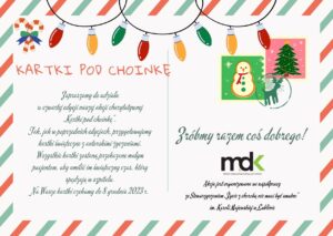 Zapraszamy do udziału w czwartej edycji naszej akcji charytatywnej „Kartki pod choinkę”. Razem ze Stowarzyszeniem „Życie z chorobą nie musi być smutne” namawiamy Was do własnoręcznego przygotowania kartek świątecznych wraz z autorskimi życzeniami.