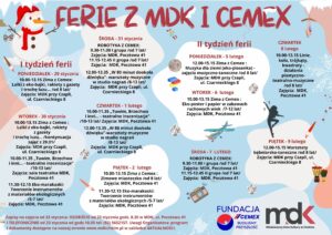 Zapraszamy dzieci i młodzież do spędzenia ferii zimowych z MDK. W trakcie realizowana będzie też akcja Zima z Cemex. Przygotowaliśmy dla Was ciekawą ofertę, w której każdy znajdzie coś dla siebie. Zajęcia są bezpłatne.