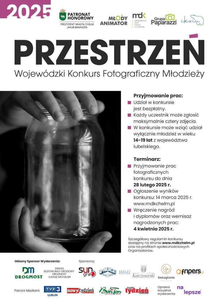 Z radością ogłaszamy rozpoczęcie Wojewódzkiego Konkursu Fotograficznego Młodzieży „Przestrzeń 2025”! To wyjątkowe wydarzenie, którego Organizatorami są Młodzieżowy Dom Kultury w Chełmie oraz Grupa Paparazzi & Młody Animator MDK Chełm. Konkurs odbywa się pod Honorowym Patronatem Prezydenta Miasta Chełm Jakuba Banaszka. Partnerem wydarzenia jest Centrum Kształcenia Zawodowego i Ustawicznego w Chełmie.