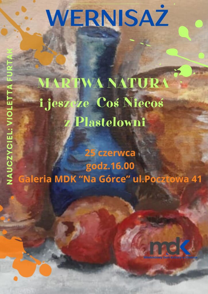 Pracownia plastyczna Plastelownia zaprasza do obejrzenia wystawy pt. „Martwa natura i jeszcze coś niecoś z Plastelowni”. Składające się na wystawę prace powstały pod kierunkiem Violetty Furtak. Ekspozycję można oglądać w Galerii MDK „Na Górce” przy ul. Pocztowej 41. Zapraszamy.