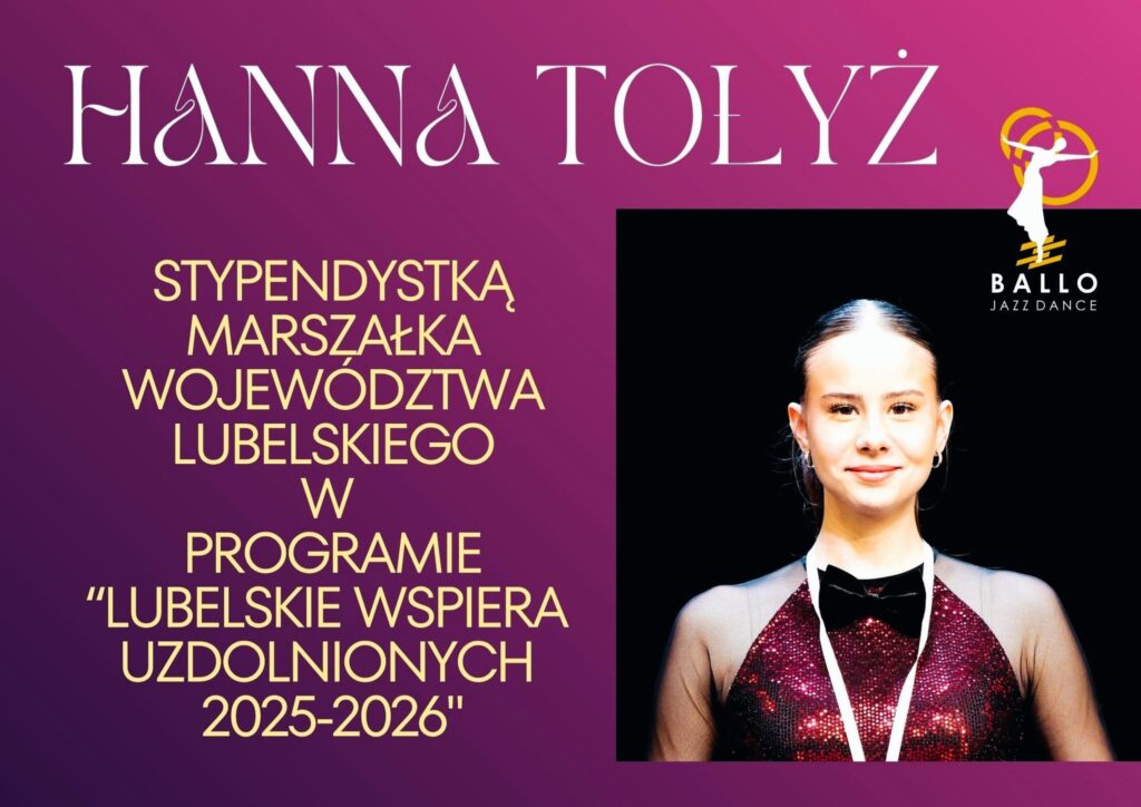 Wśród grona zdolnej młodzieży znalazła się Hanna Tołyż z Zespołu Tańca Jazzowego BALLO. Hania od wielu lat rozwija swoje umiejętności i szlifuje taneczny talent w Młodzieżowym Domu Kultury w Chełmie pod kierunkiem Sabiny Englot.